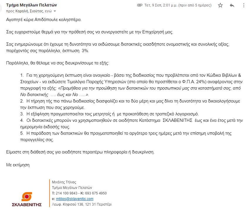 Η διαφορά είναι ότι ο Σκλαβενίτης παρέχει έκπτωση 3% σε κάθε διατακτική ενώ